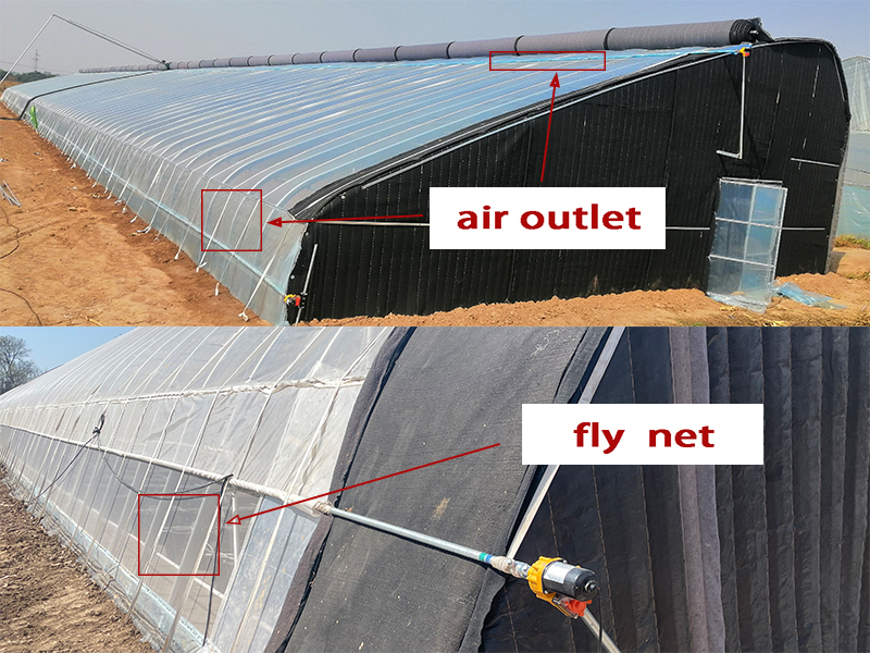 Greenhouse ventilation is a key measure to regulate the environment inside the greenhouse (such as temperature, humidity, carbon dioxide concentration, etc.), and the air outlet is the core component of the ventilation system. Reasonable design and management of air outlets can effectively improve the growth conditions of crops and reduce the risk of pests and diseases. All ventilation openings should be covered with 40 to 80 mesh insect-proof nets to prevent the invasion of pests. | |